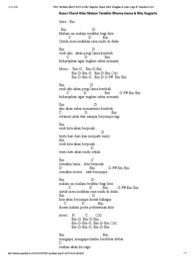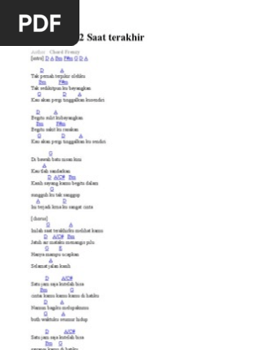 Lirik Lagu Saat Terakhir Chord Gitar from imgv2-1-f.scribdassets.com A/c# bm kasih sayang kamu begitu dalam g sungguh ku tak sanggup a d ini terjadi krna ku sangat cinta reff : (**) c g satu jam saja kutelah bisa am f cintai kamu kamu kamu di hatiku c g f g namun bagiku melupakanmu butuh waktuku seumur hidup c g am f satu jam saja. G a inilah saat terakhirku melihat kamu d a/c# bm jatuh air mataku menangis pilu g e hanya mampu ucapkan a selamat jalan kasih.