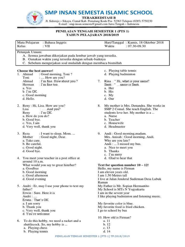 10+ Soal Bahasa Inggris Kelas 1 Smp Semester 1. Soal uas bahasa inggris kelas 1 sd. Choose the correct answer by crossing (x) a,b,c, or d.